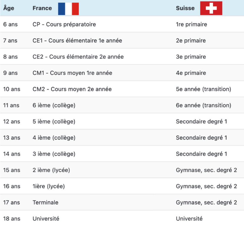 Possibilité de passer du système suisse au programme français en suivant tout d’abord les équivalences, puis d’évaluer le niveau « réel » de l’élève et de s’y adapter.